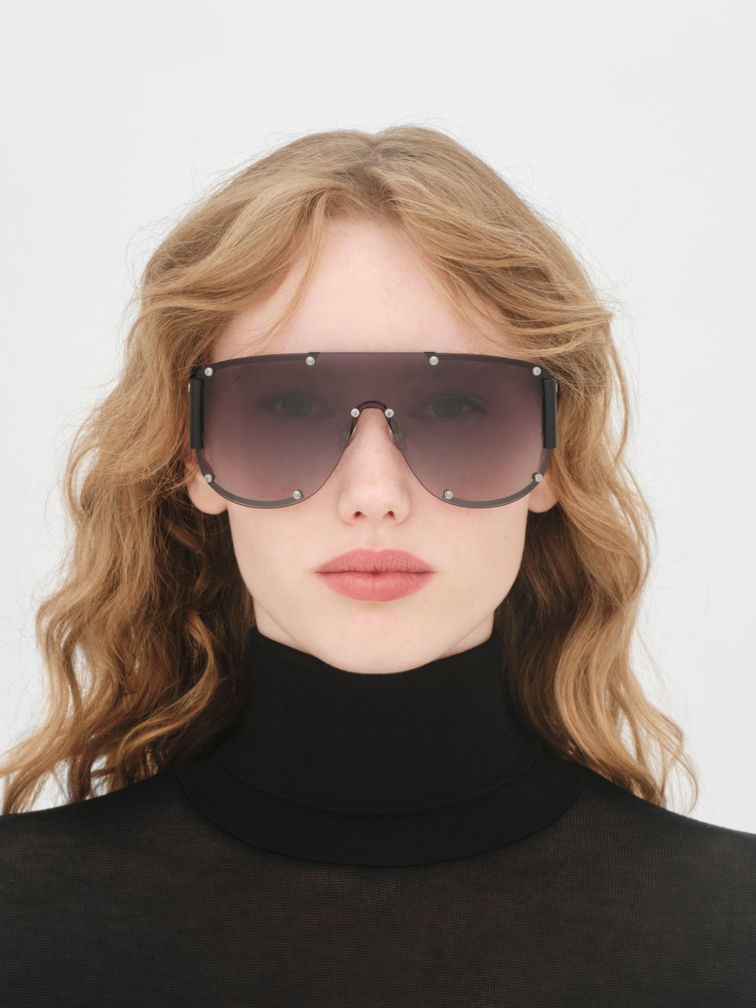 Displayed here in Black with a Black lens, the Shield is also available in Rose Gold and Silver.